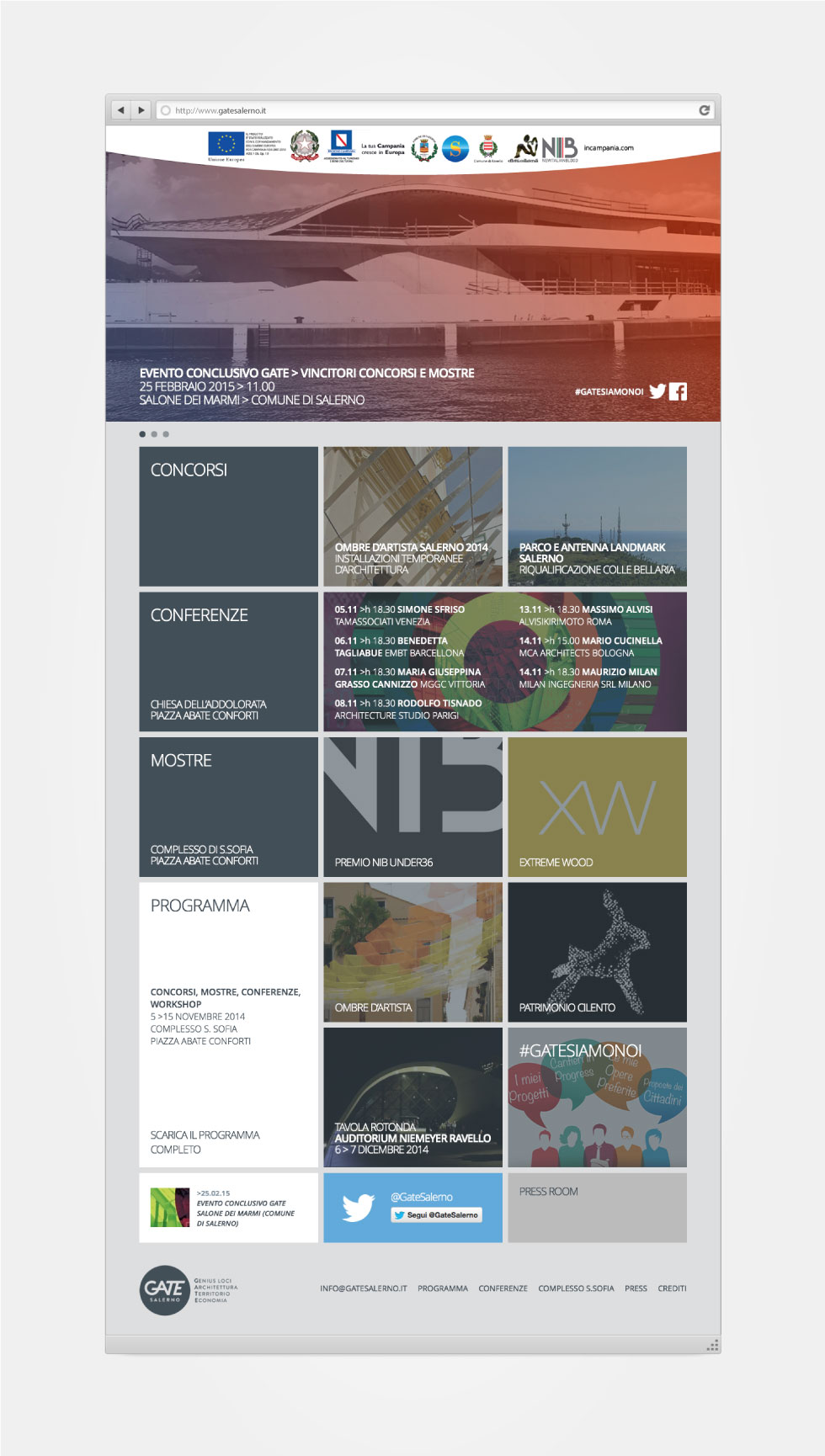 3 cataloghi, 1 sito, una campagna con oltre 10 soggetti, 2 mostre allestite, 3 account social gestiti, 15 eventi live coperti: il nostro contributo a GATE, il primo festival internazionale dell’Architettura. I migliori architetti europei hanno partecipato all’evento per una serie di lectio magistralis: Cucinella, Tisnado, Tagliabue tra i nomi più noti. Tutti gli appuntamenti hanno ottenuto rilievo su scala nazionale ed una partecipazione davvero folta da parte di addetti al settore, studenti e di un pubblico di curiosi.