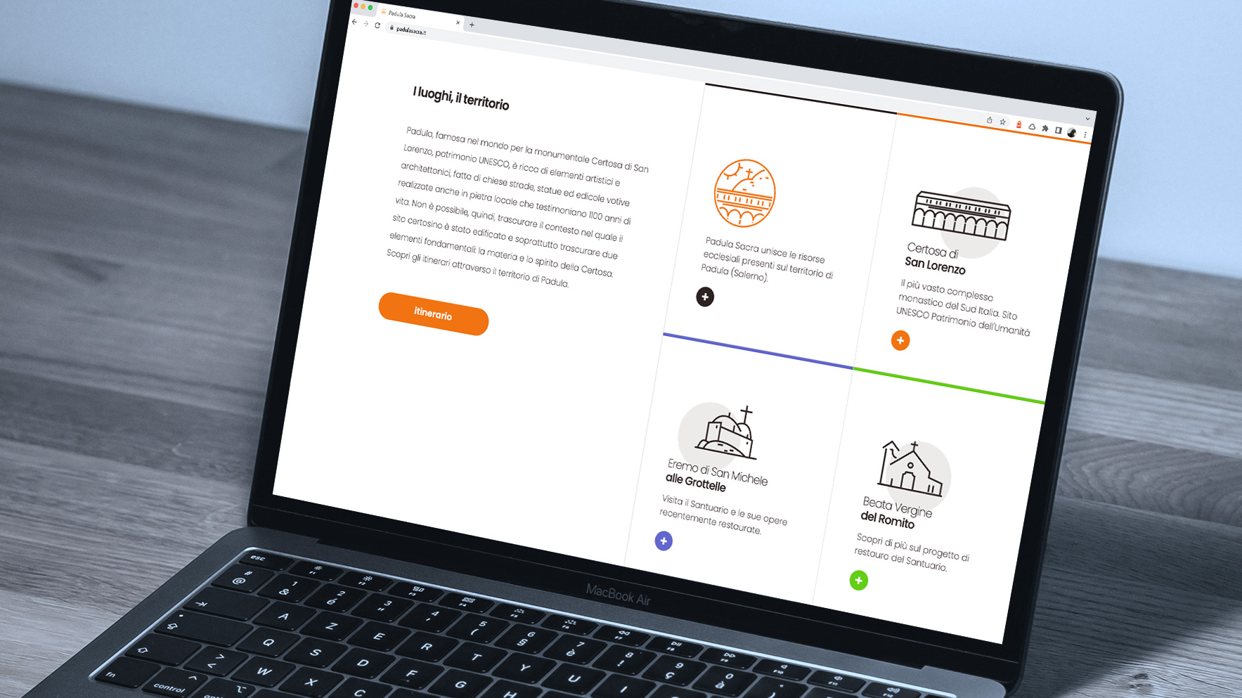 Un intervento completo ed efficace di promozione e valorizzazione dei luoghi. Marketing, turismo e territorio sono le componenti di questo progetto che ha coinvolto istituzioni, progettisti e la comunità locale nella costruzione di una nuova identità per la città di Padula, famosa in tutto il mondo per la Certosa Monumentale. Alla nostra Agenzia è stato affidato l’intero lavoro di progettazione dell’identità, dei contenuti, degli strumenti di comunicazione e segnaletica, di marketing digitale e relazioni pubbliche. Un intervento di successo che rappresenta già un modello in replica in altri territori.