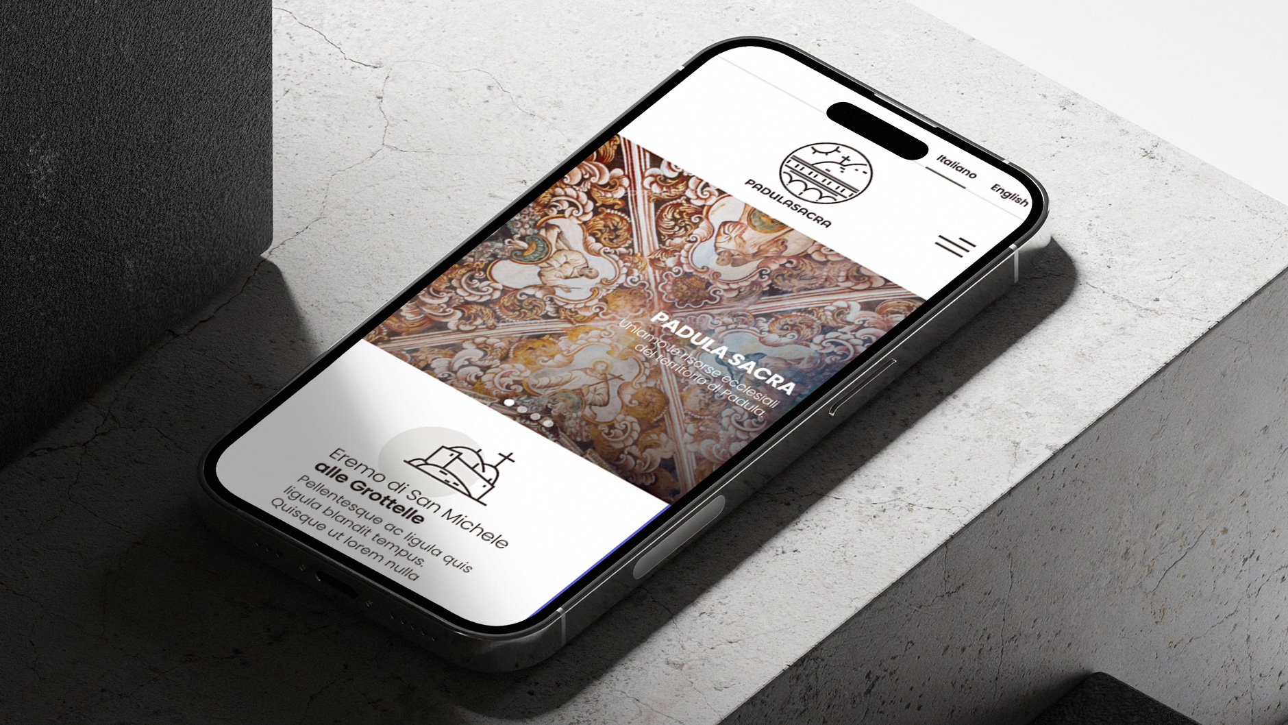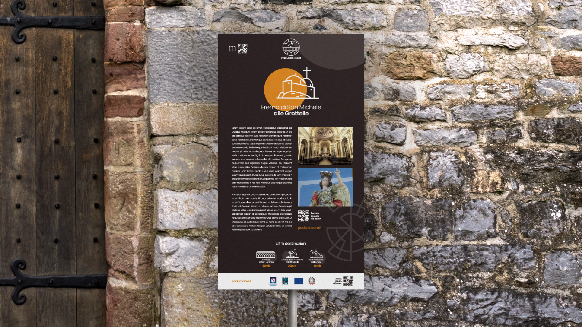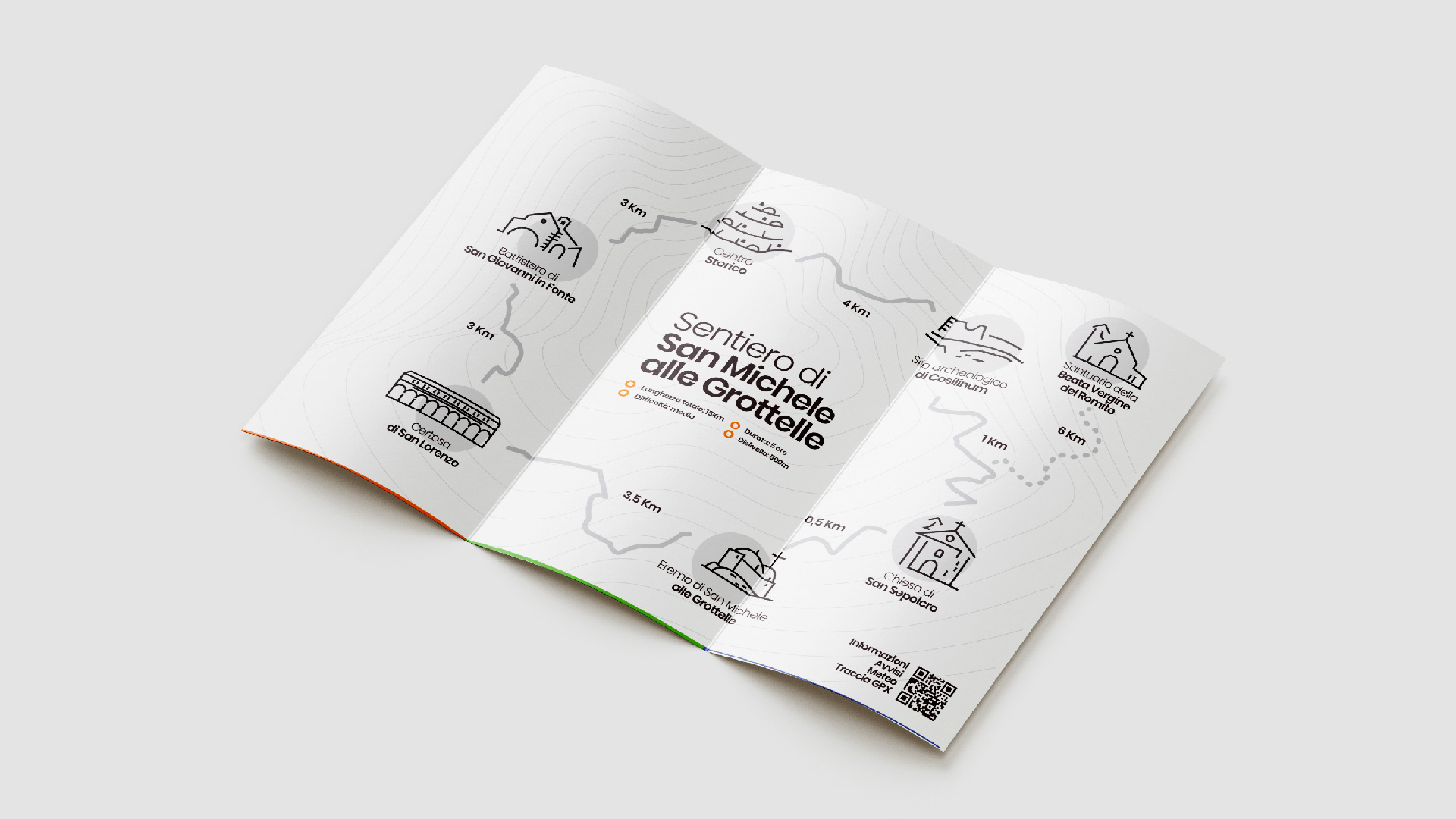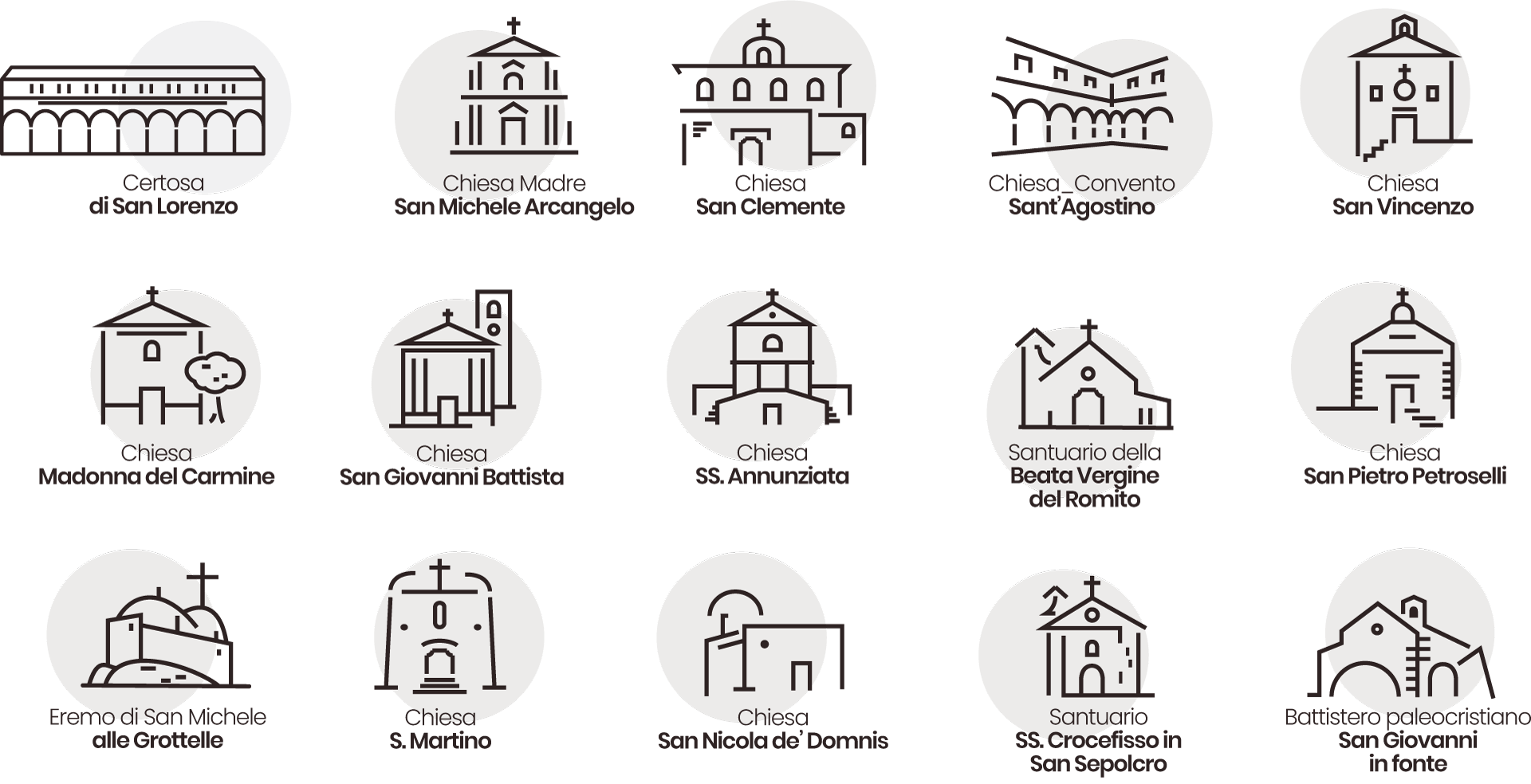 Ogni punto di interesse del sistema Padula Sacra viene rappresentato attraverso la stilizzazione del luogo, in forma iconica. In questo modo riusciamo a comunicare più efficacemente l’aspetto e la qualità del punto di interesse e a lavorare positivamente sulla sua percezione del pubblico: in questo modo ogni punto diventa subito più familiare.